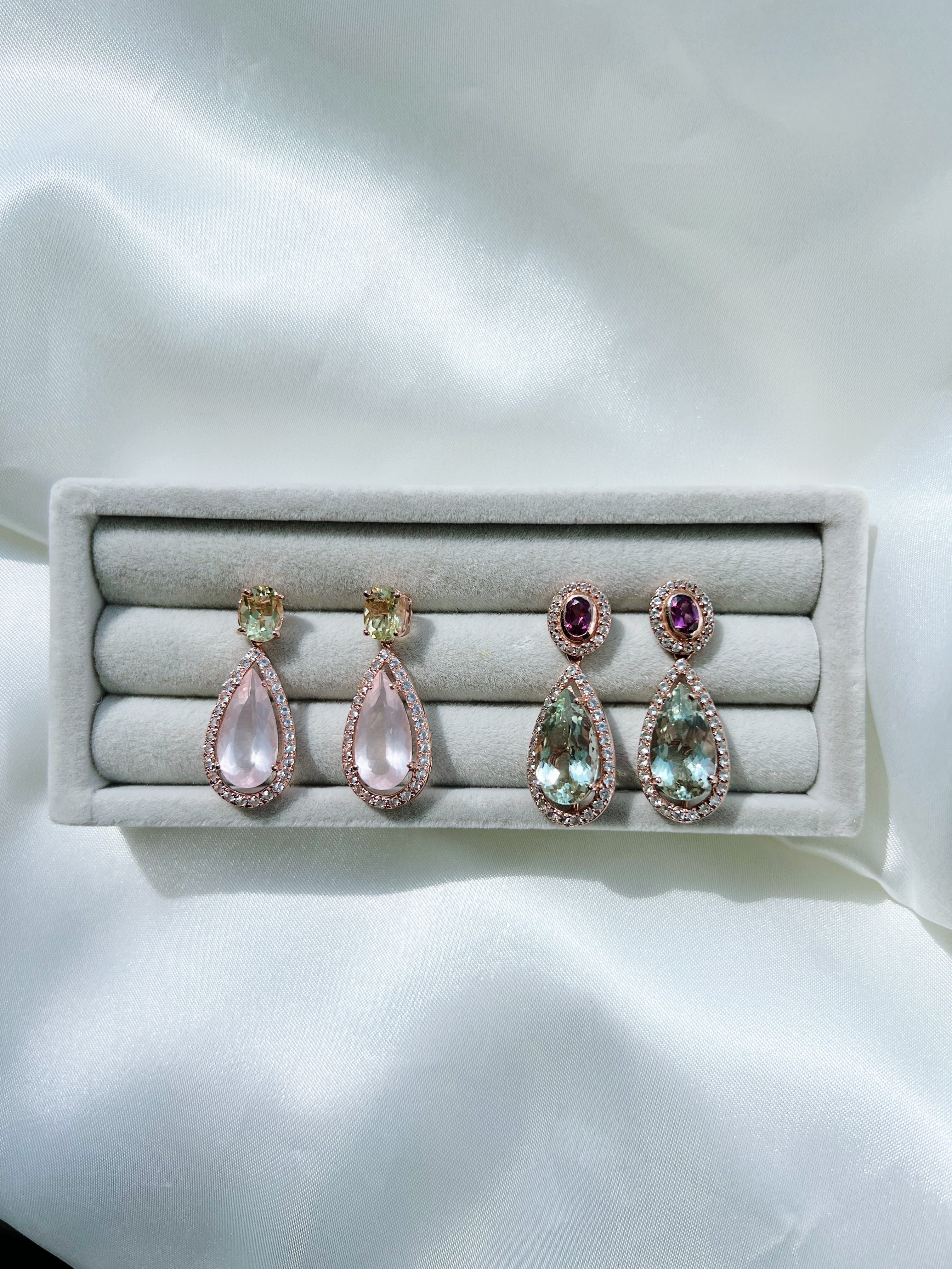 とても映える一品です。ローズクォーツの周りにはホワイトトパーズのメレで囲んでいます。