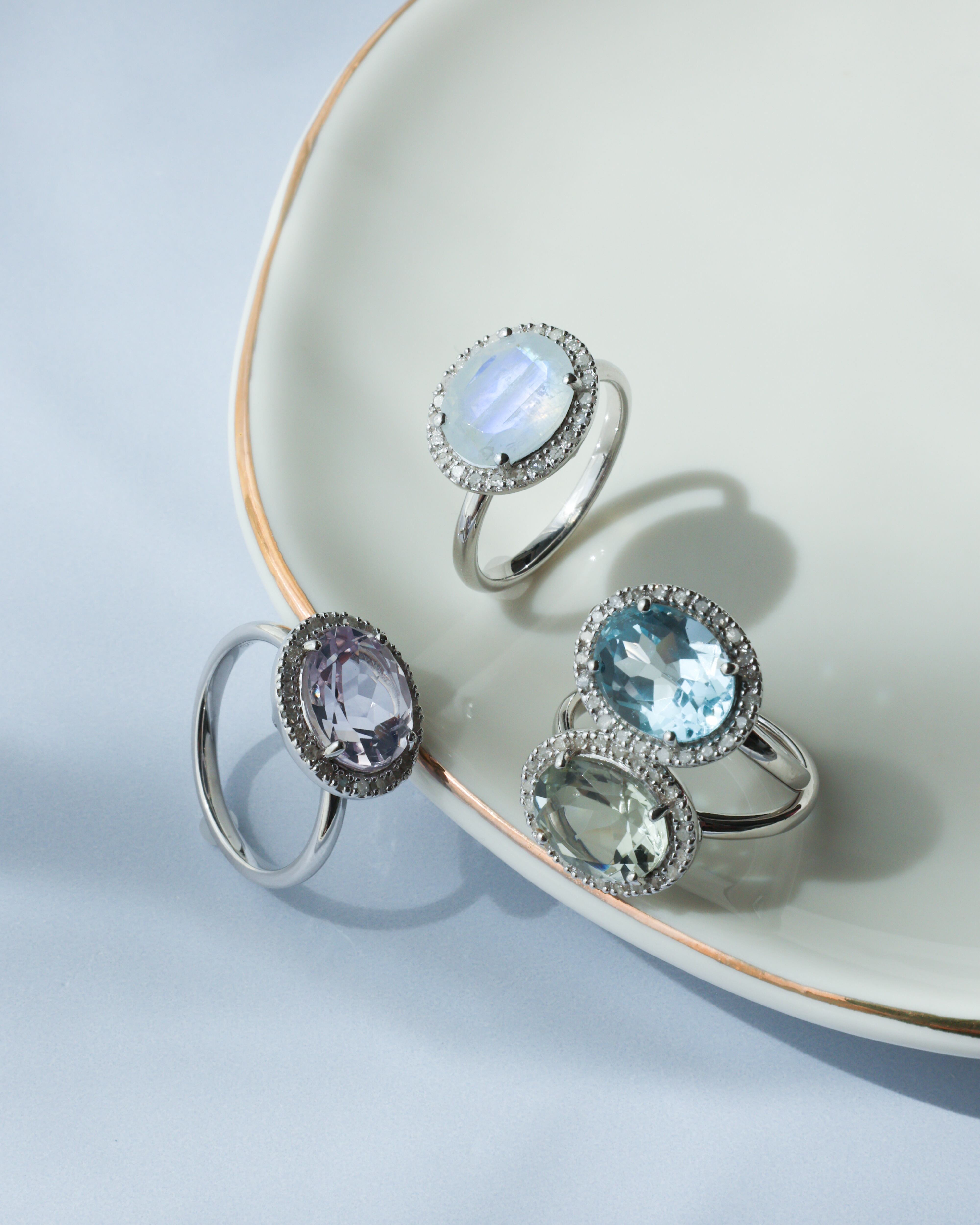 神秘的な乳白色のラベンダークォーツの周りをメレダイヤが一周したデザインのリングです。