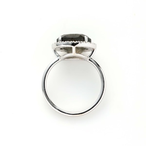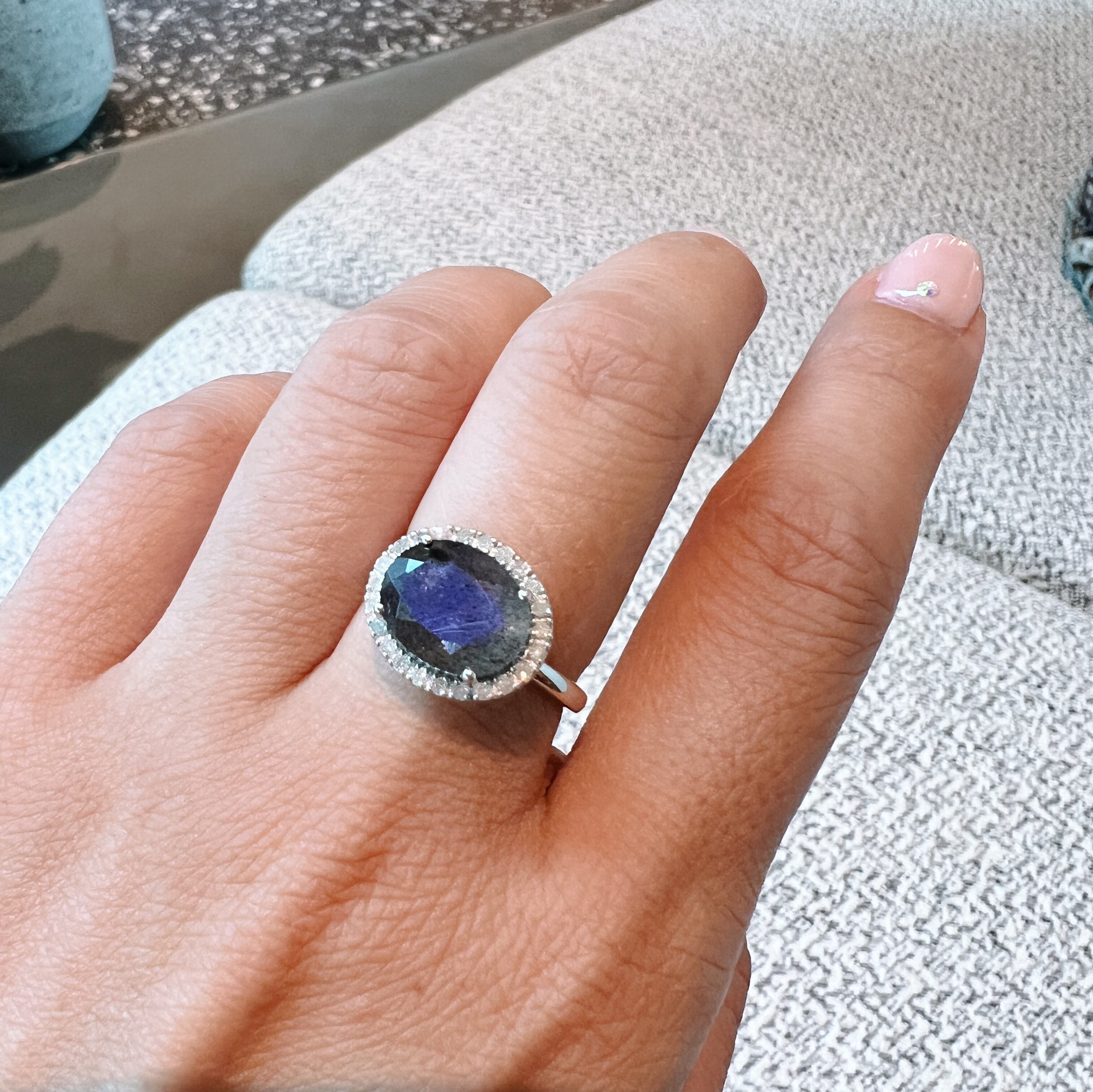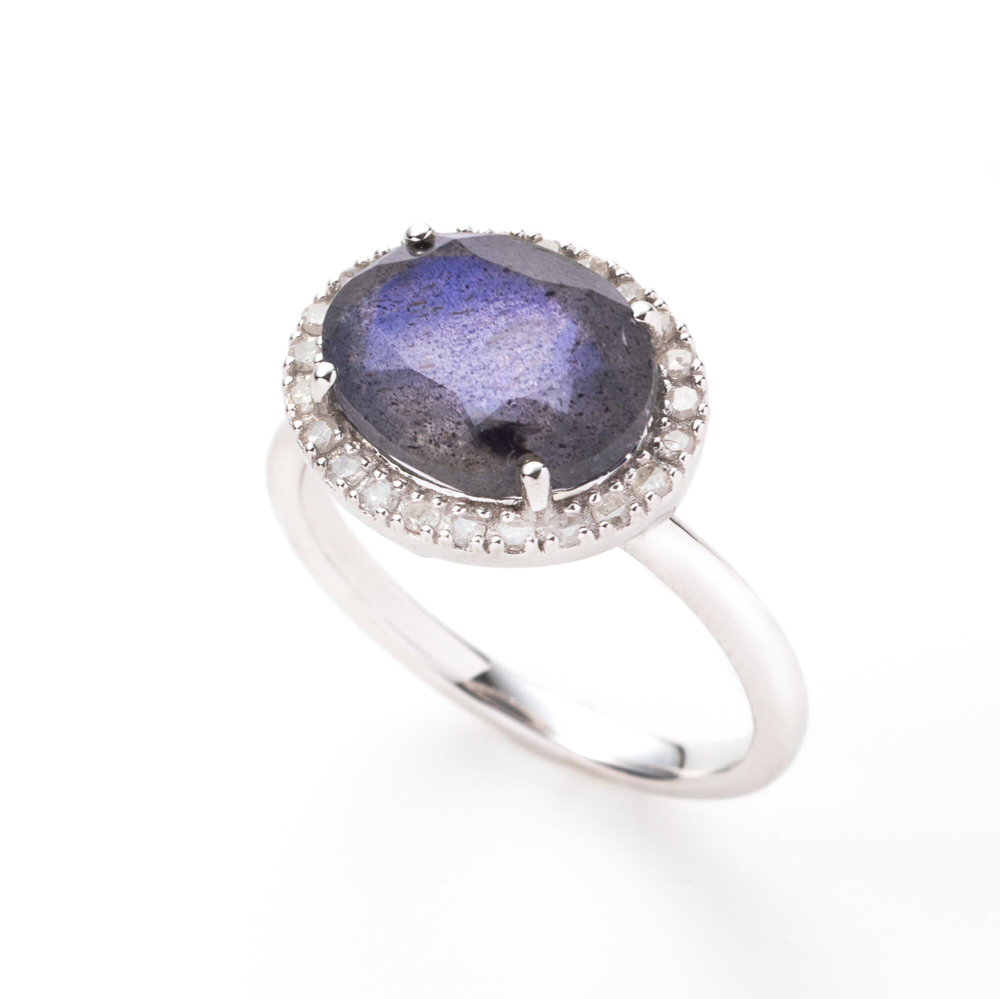 遊色が綺麗なラブラドライトの周りをメレダイヤが一周したデザインのリングです。