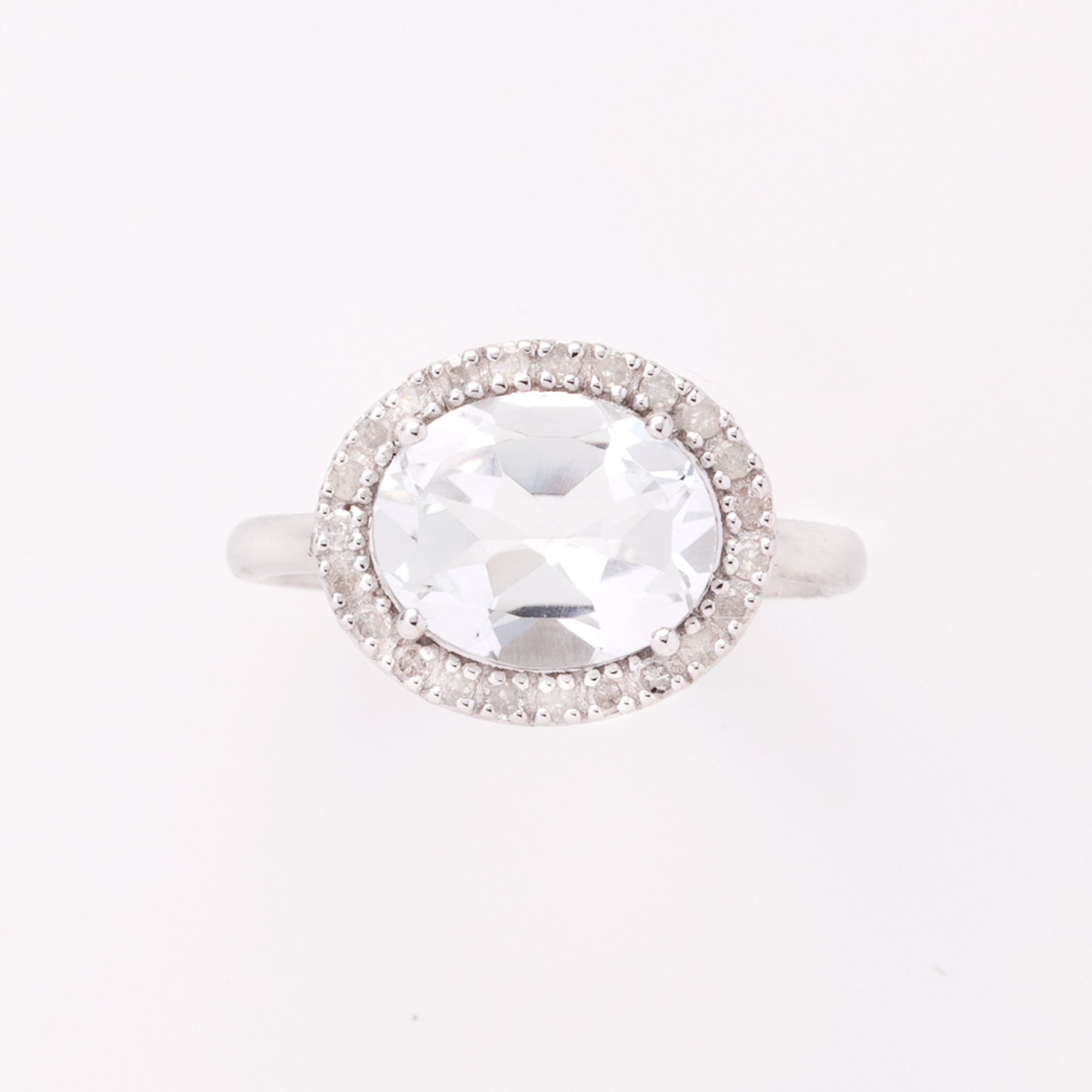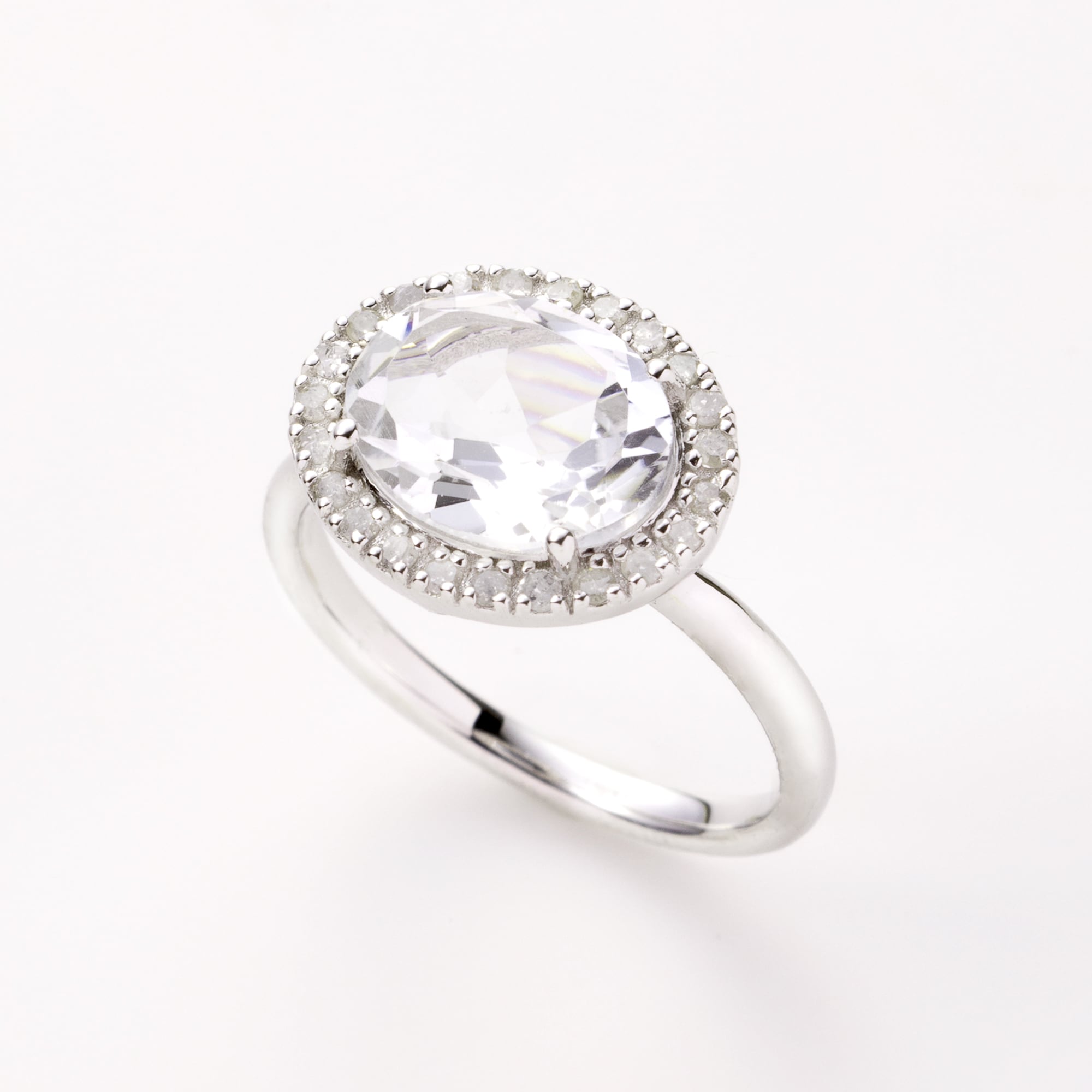 透明な輝きを持つ、ホワイトトパーズの周りをメレダイヤが一周したデザインのリングです。