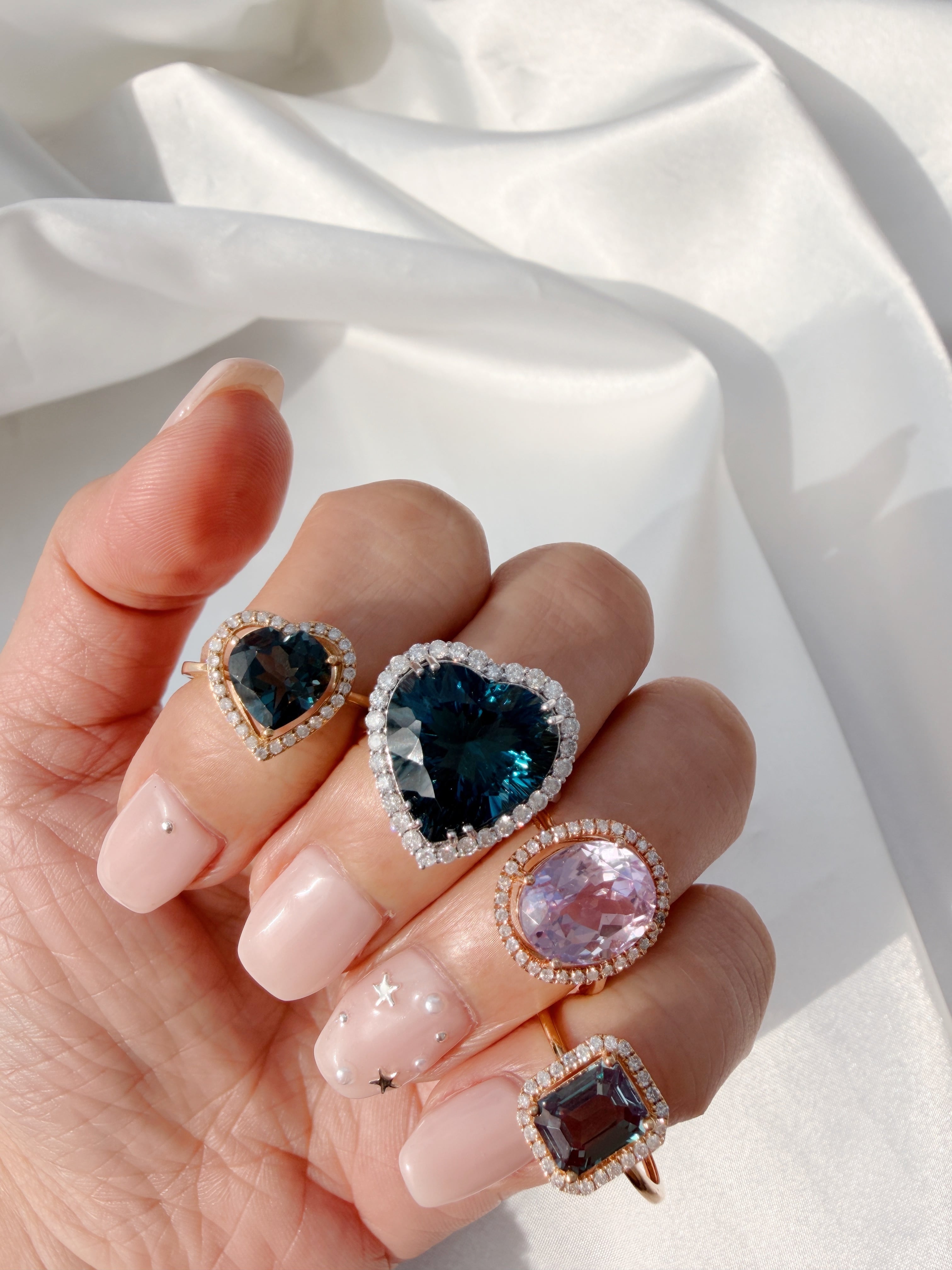 ピンクゴールドの18K素材のリングにセッティングされた大粒天然石のジュエリーは
