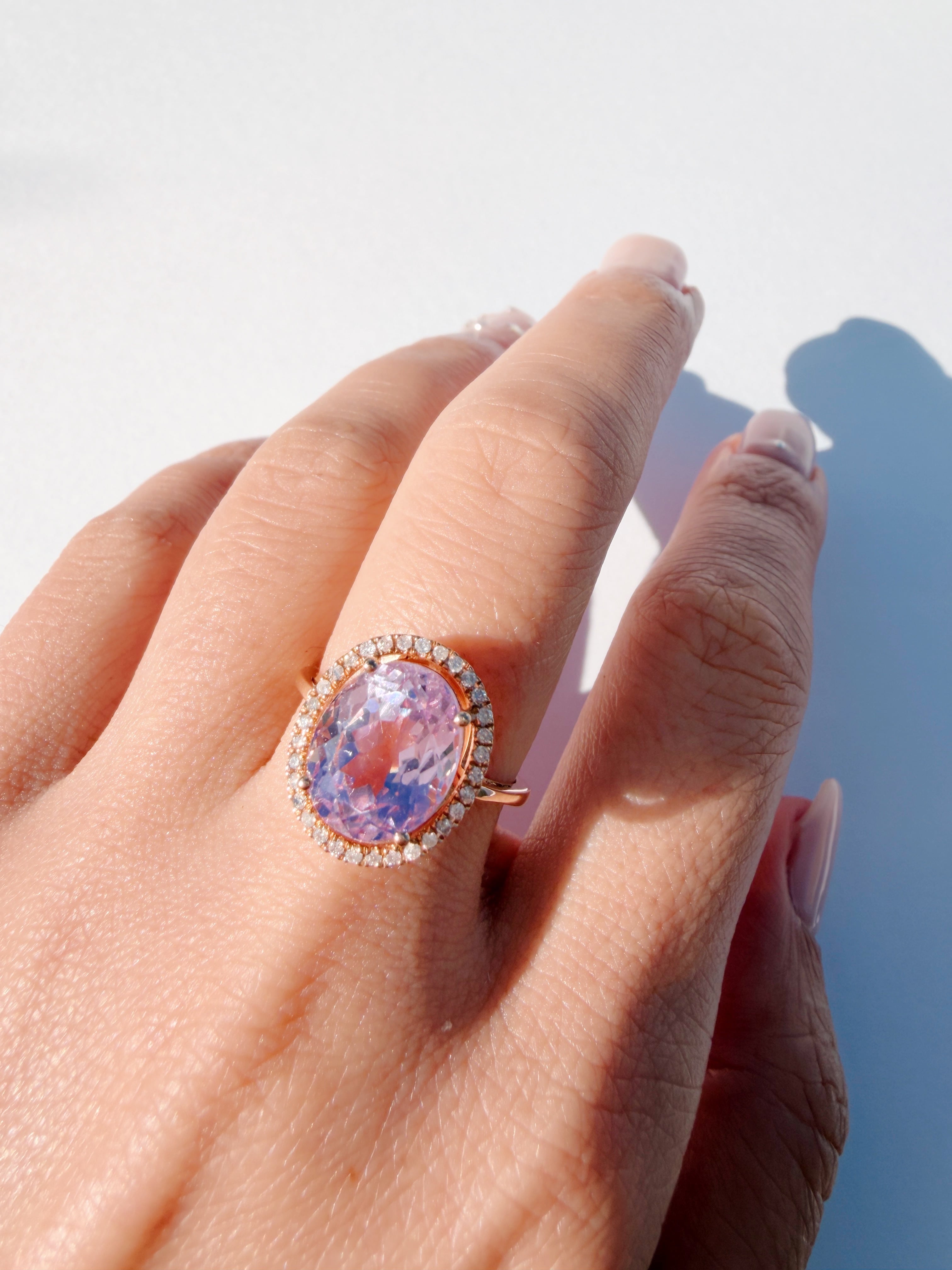 ピンク色の綺麗なクンツァイトをダイヤモンドで取り巻いたリングは、キラキラとお手元で輝きます。