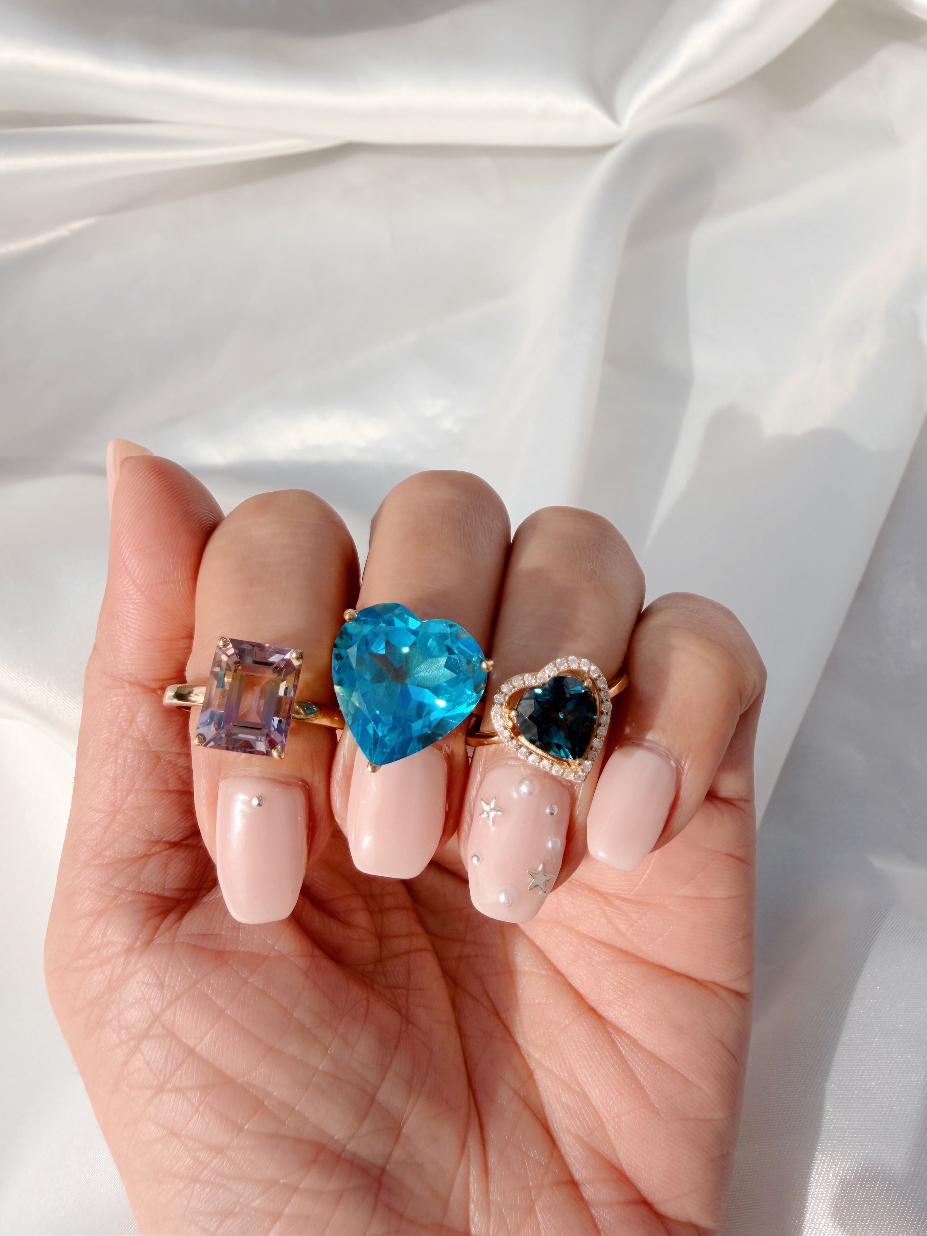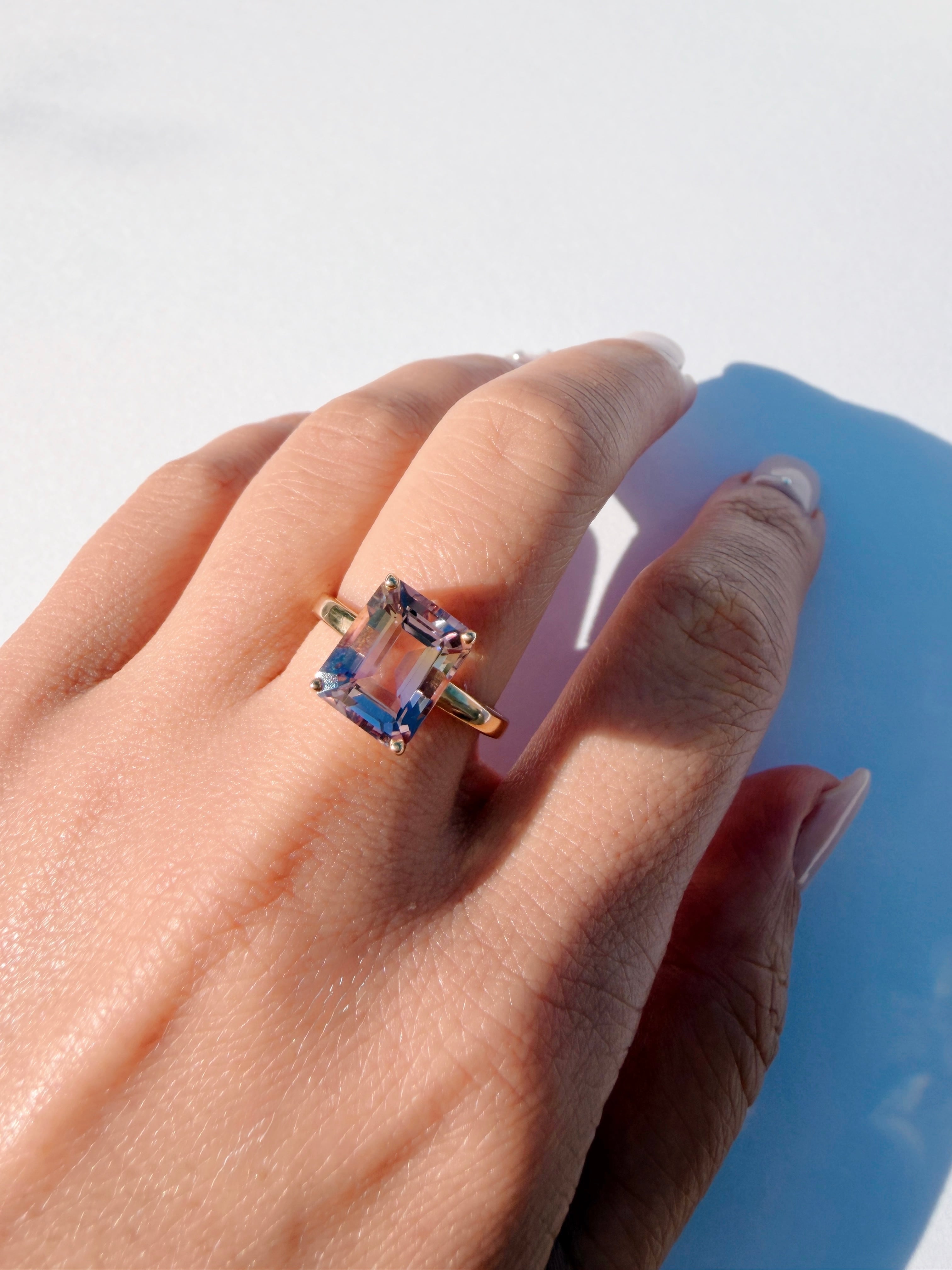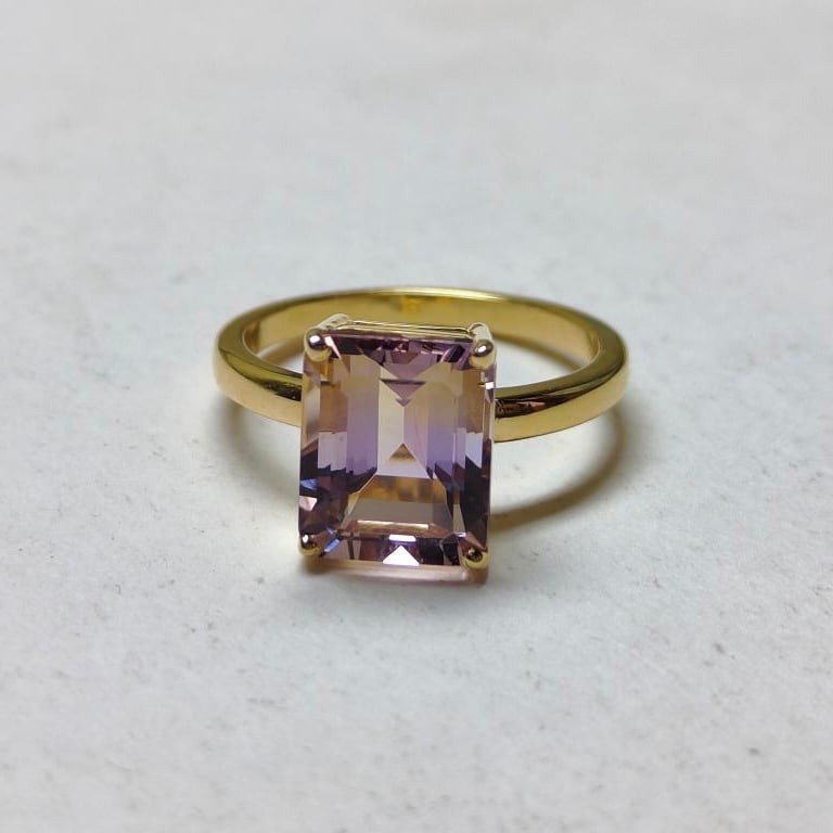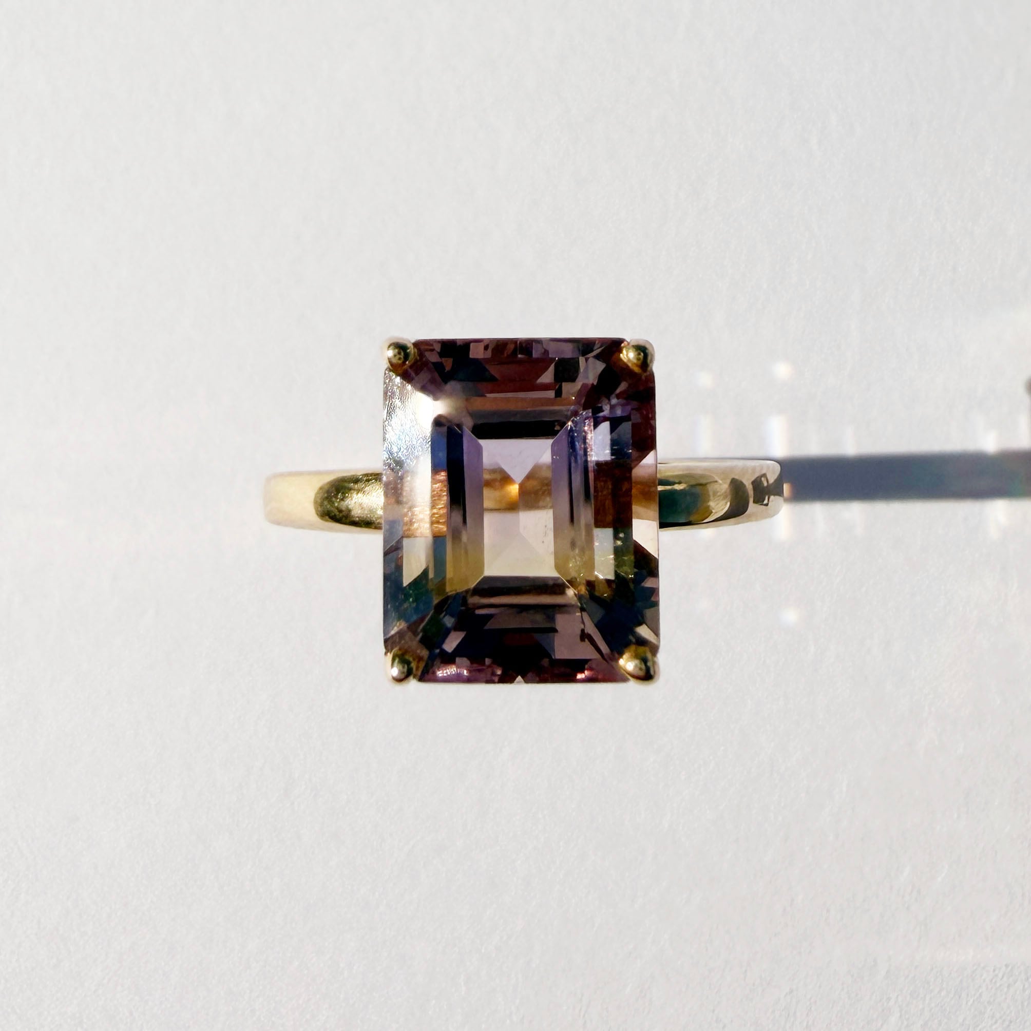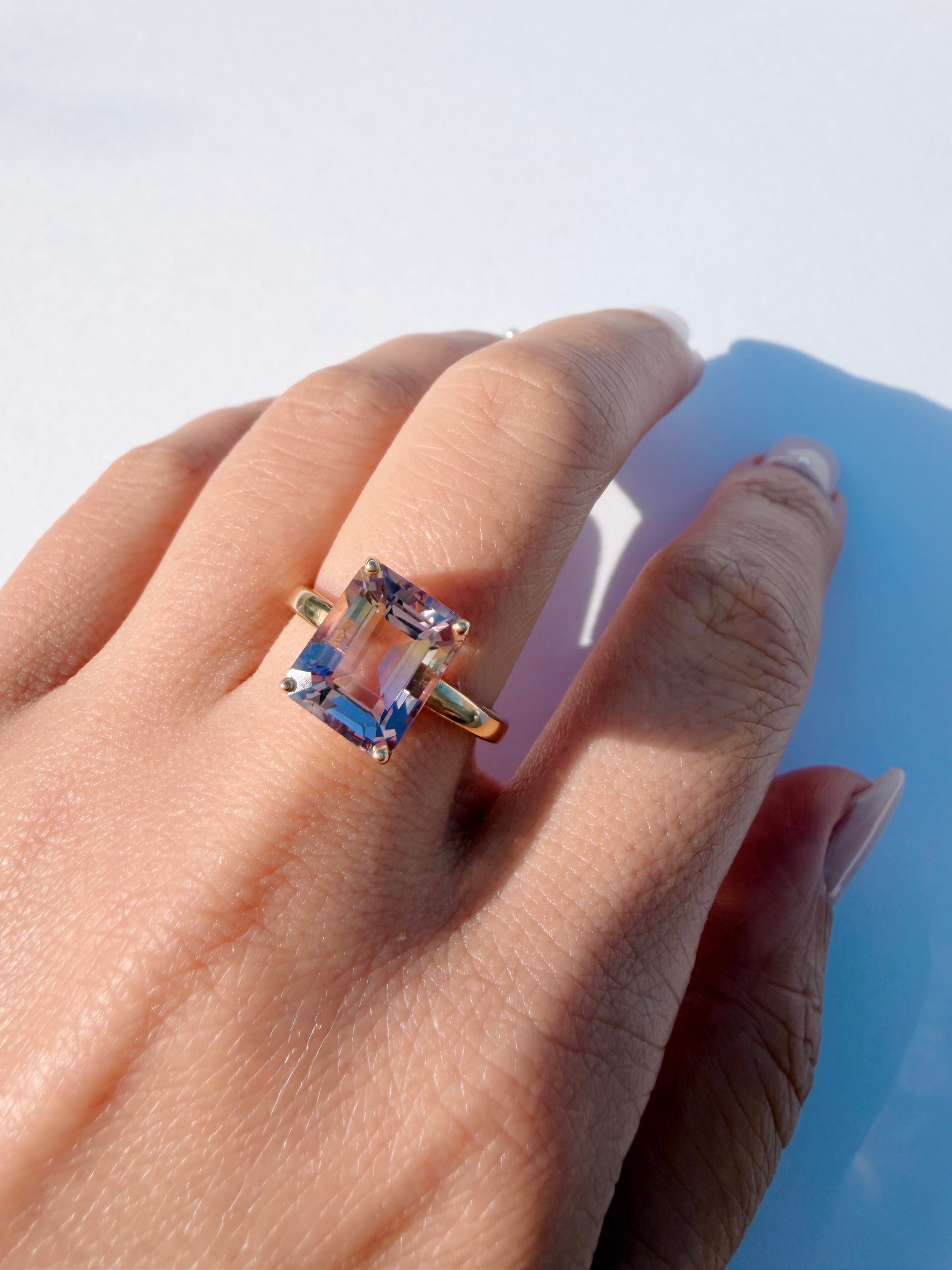 キラキラと輝くエメラルドカットのアメトリンを主役にしたリングです。
