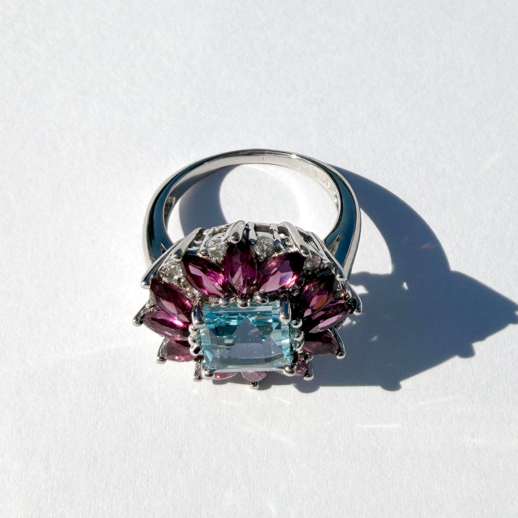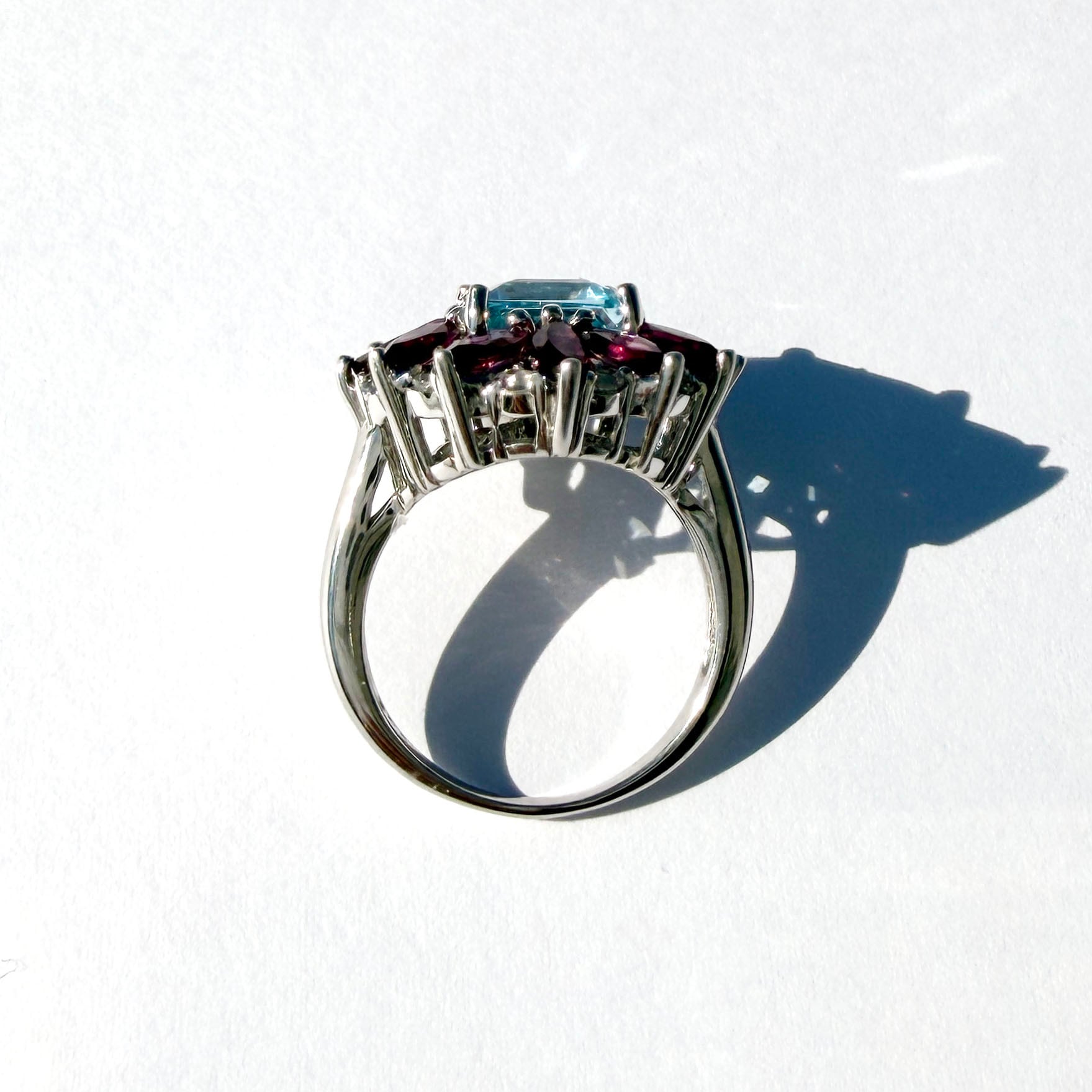 マーキスカットのロードライトガーネットがマーガレットのように配されたリング。