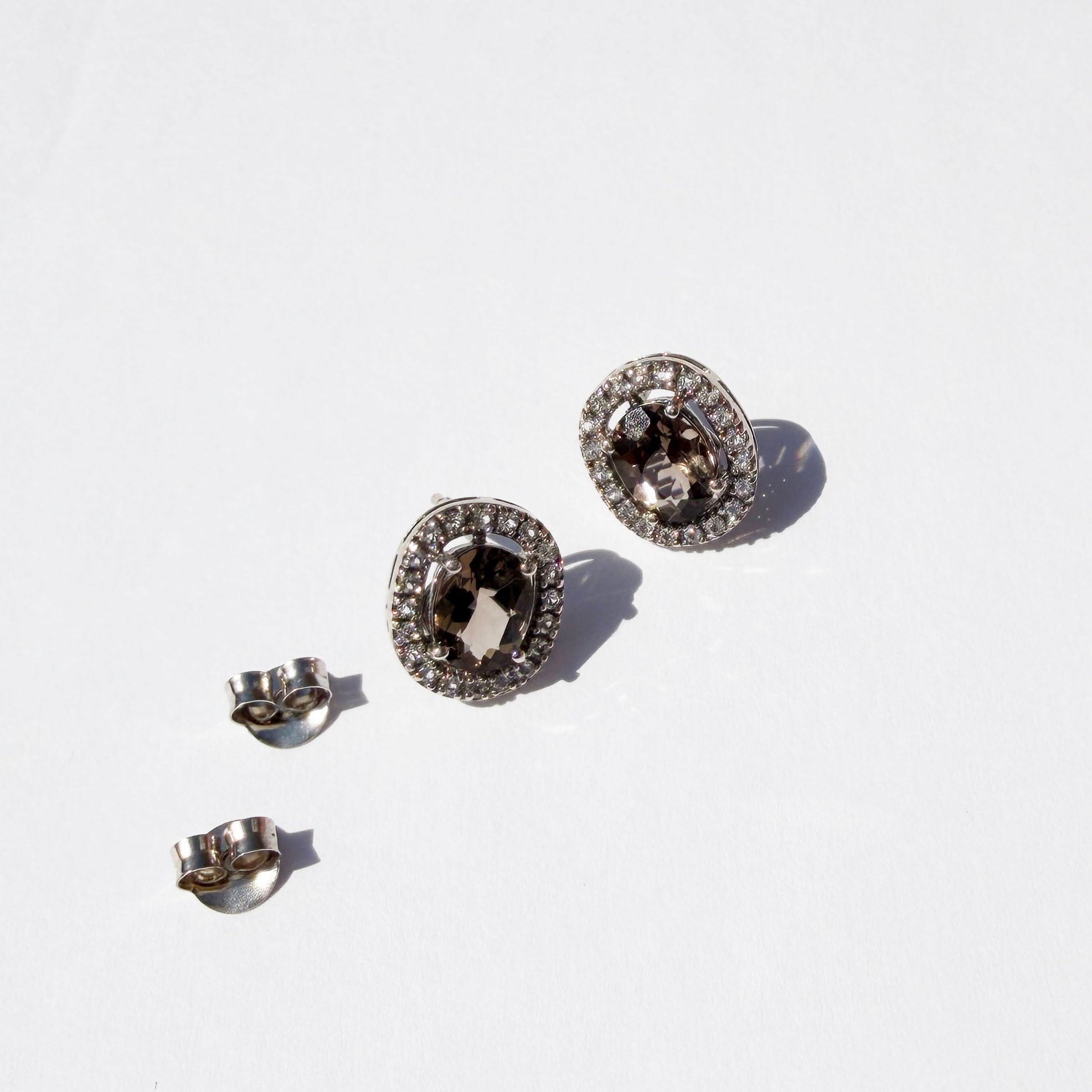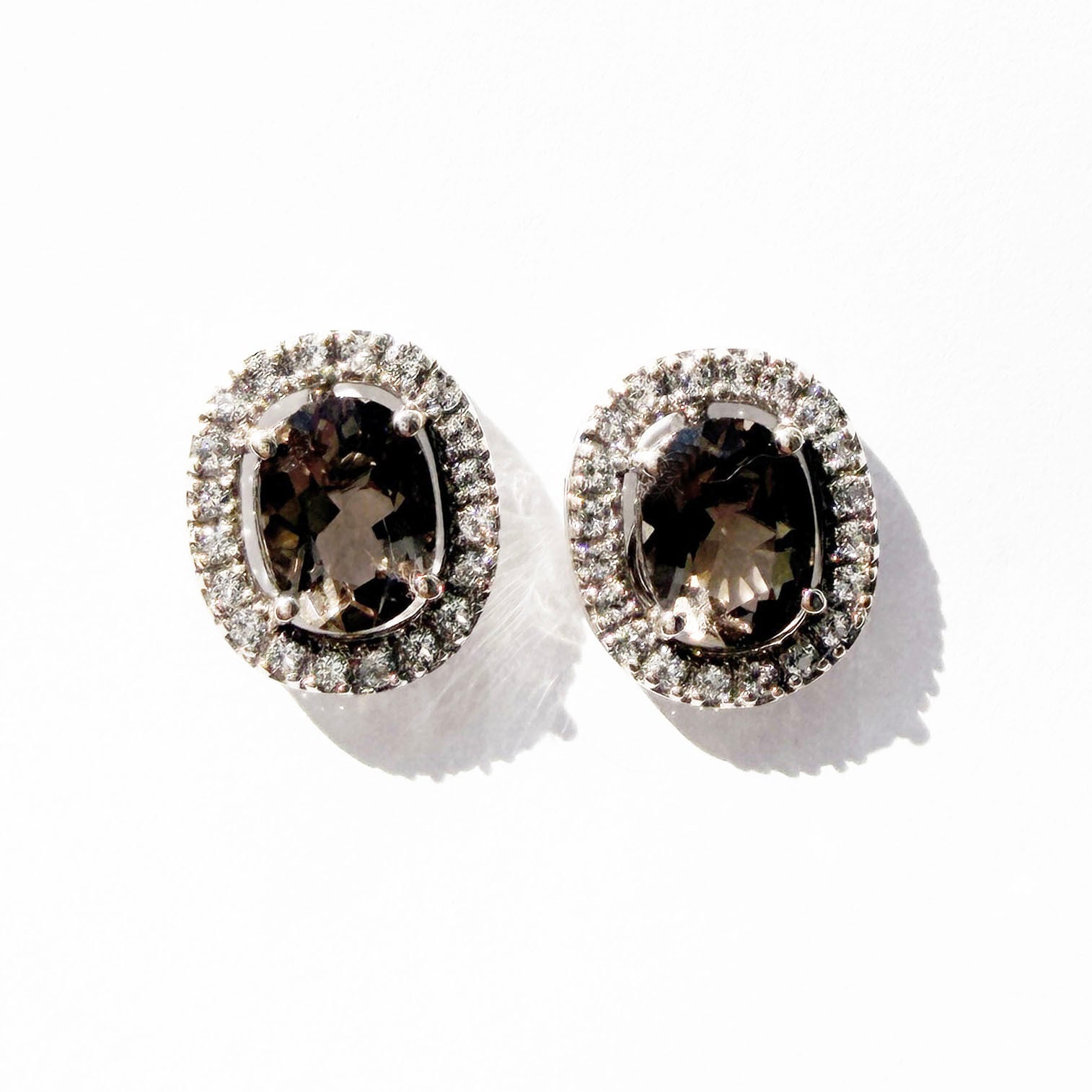 オーヴァルのスモーキークォーツを、ホワイトトパーズのメレストーンで一周させたHalo(ヘイロー)デザインのピアスです。キラキラと耳元で輝きます。