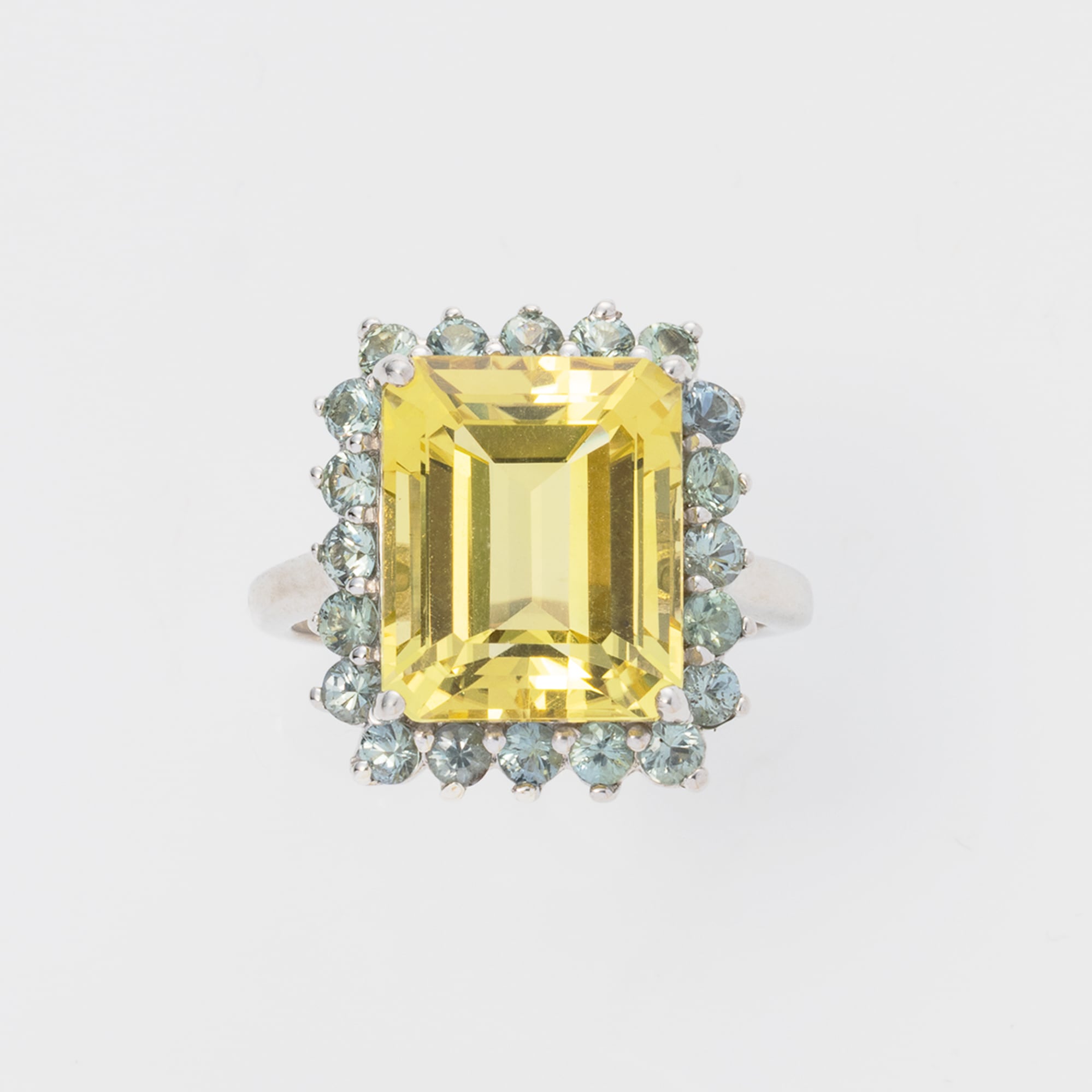 オクタゴンカットの大粒レモンクォーツに、優しい色味のサファイアのメレストーンを取り巻きました。