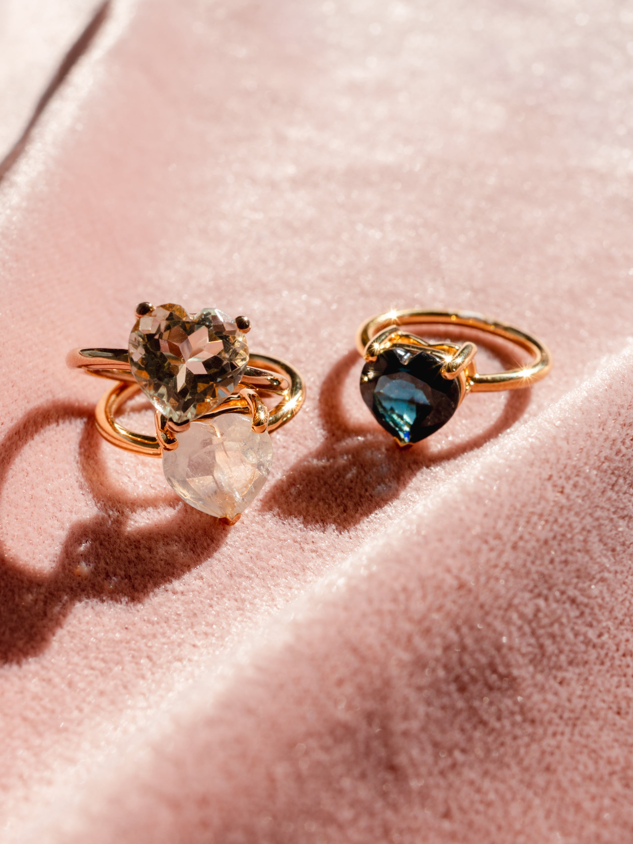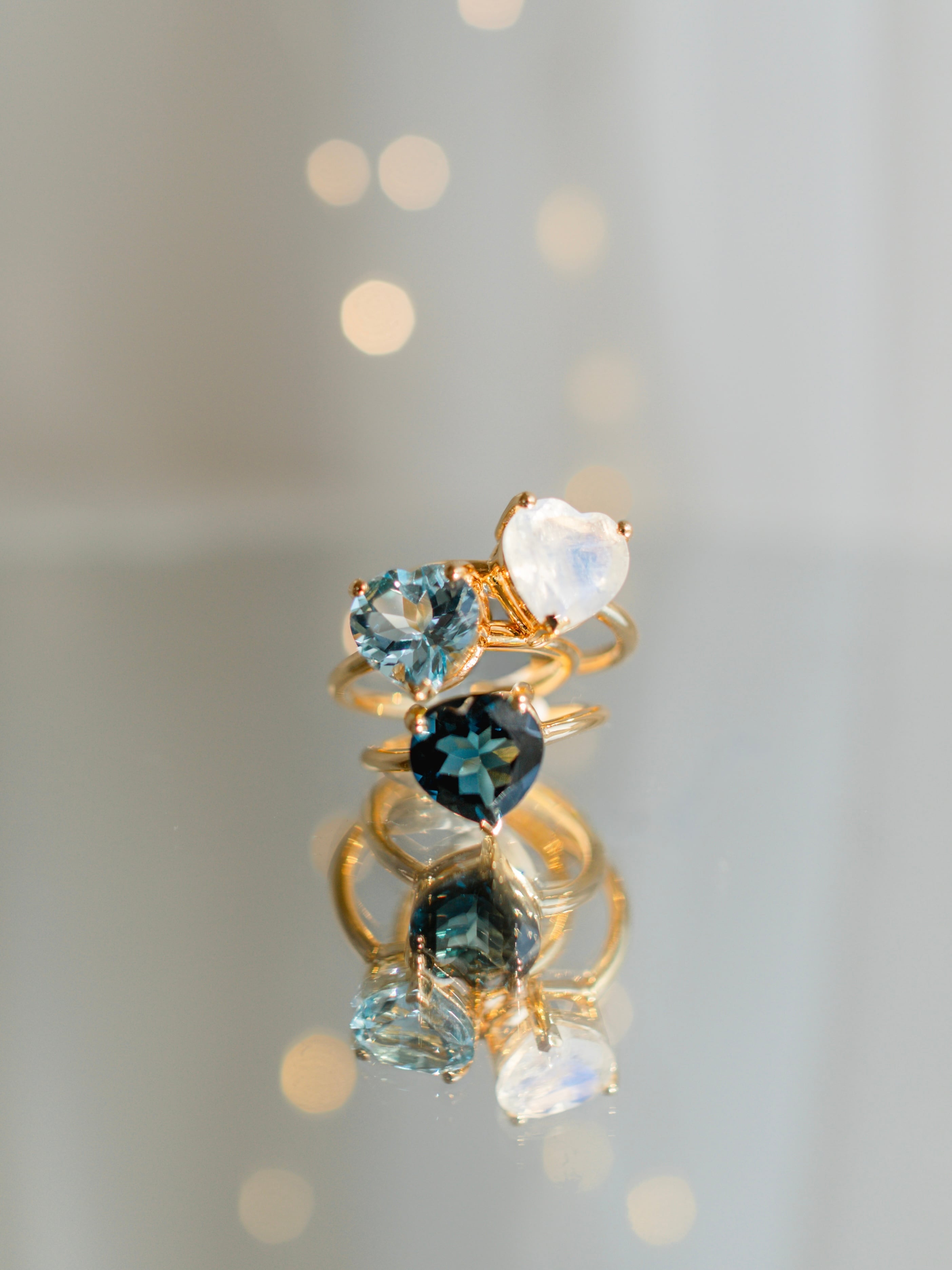 ハートにカッティングされた大粒のロンドンブルートパーズが輝くリングです。
