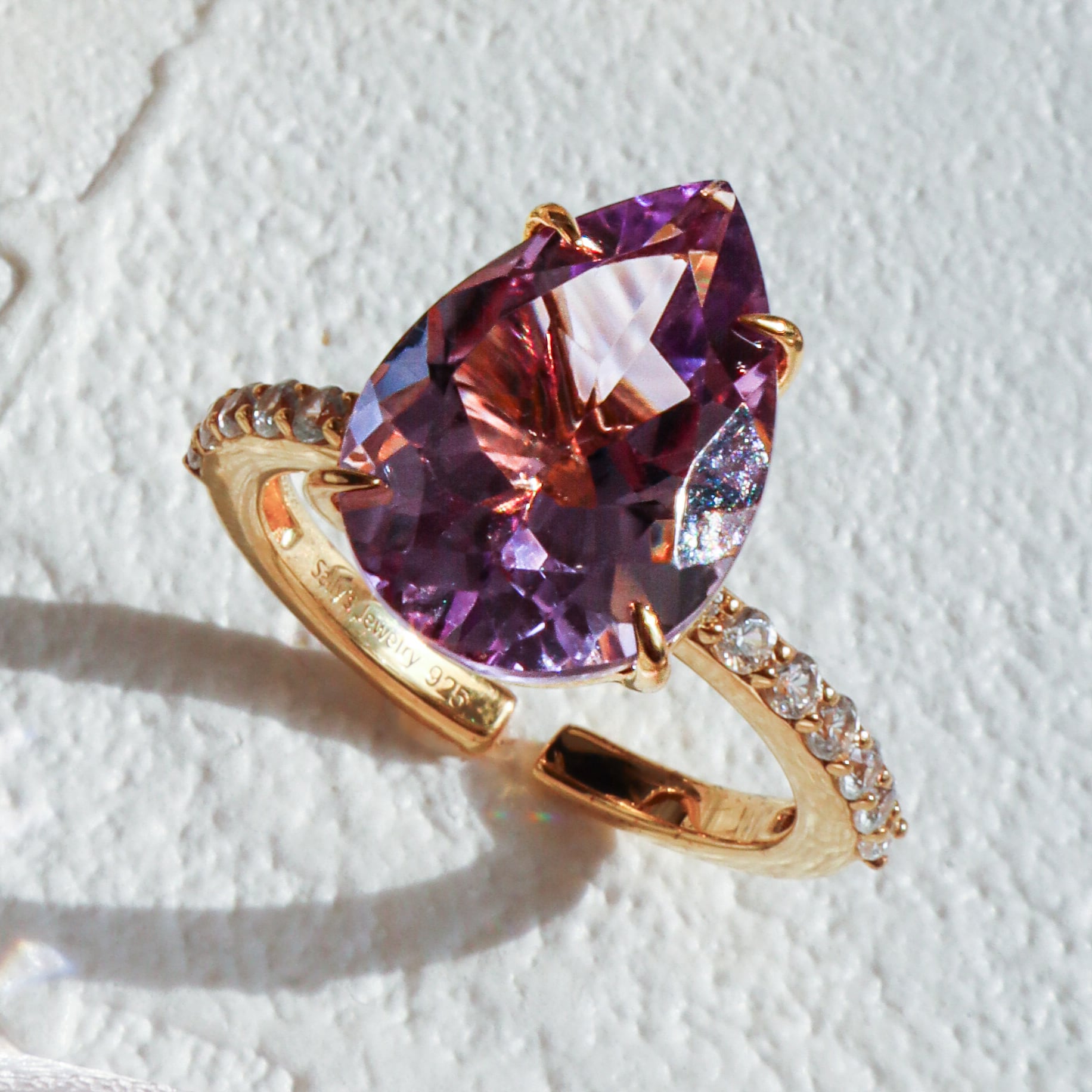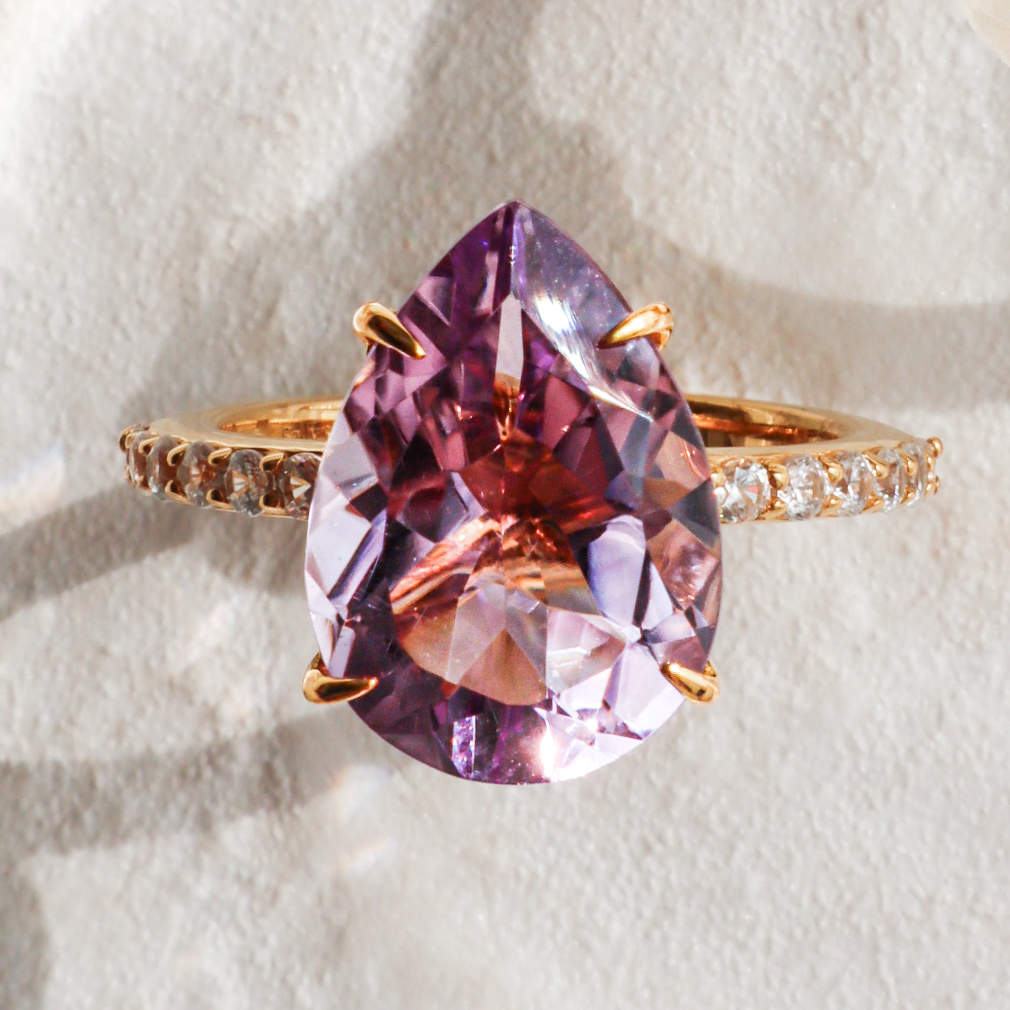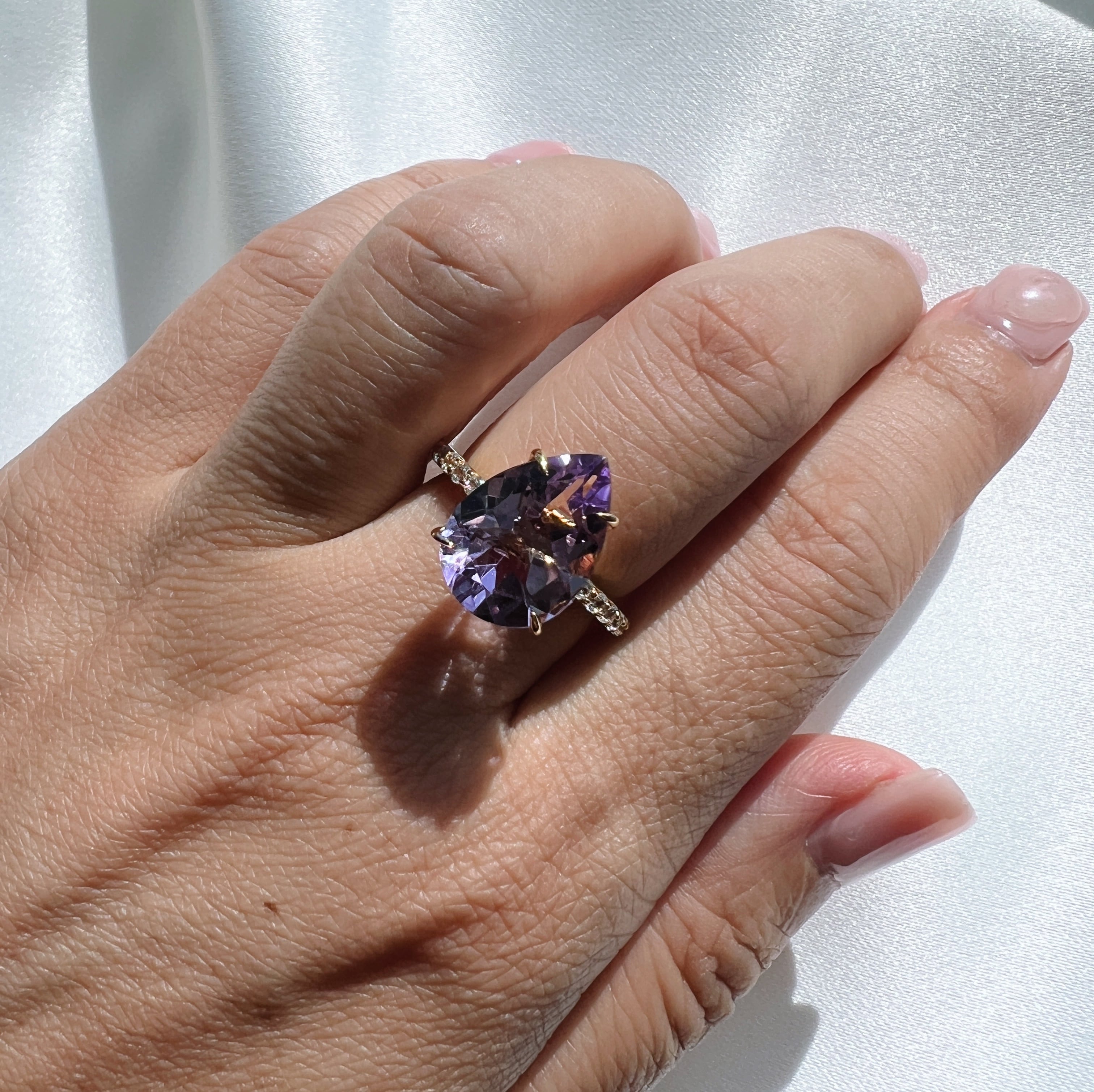 ピンク味のある大粒のアメジストをイエローゴールド色のリングにセッティングしました。