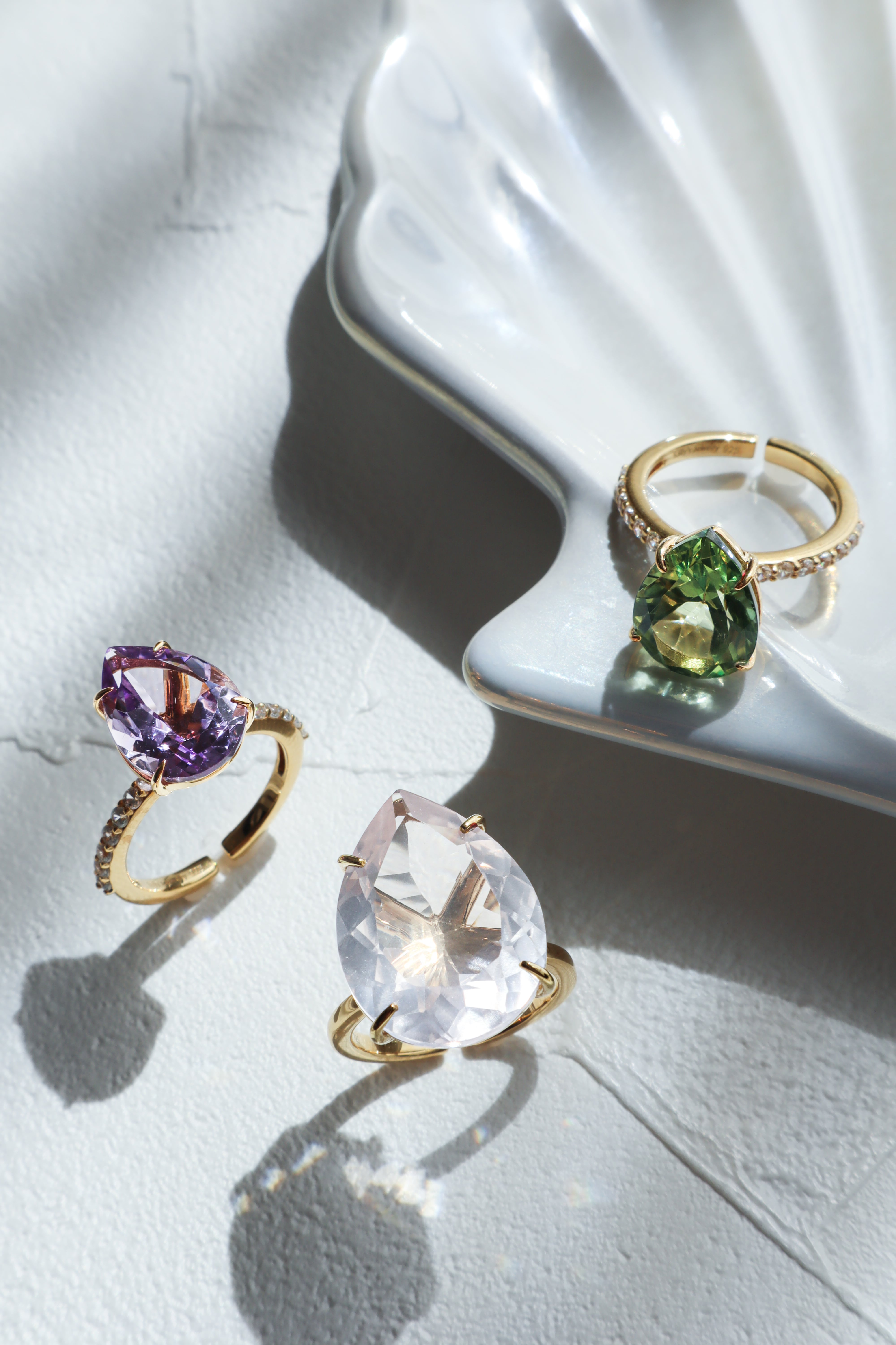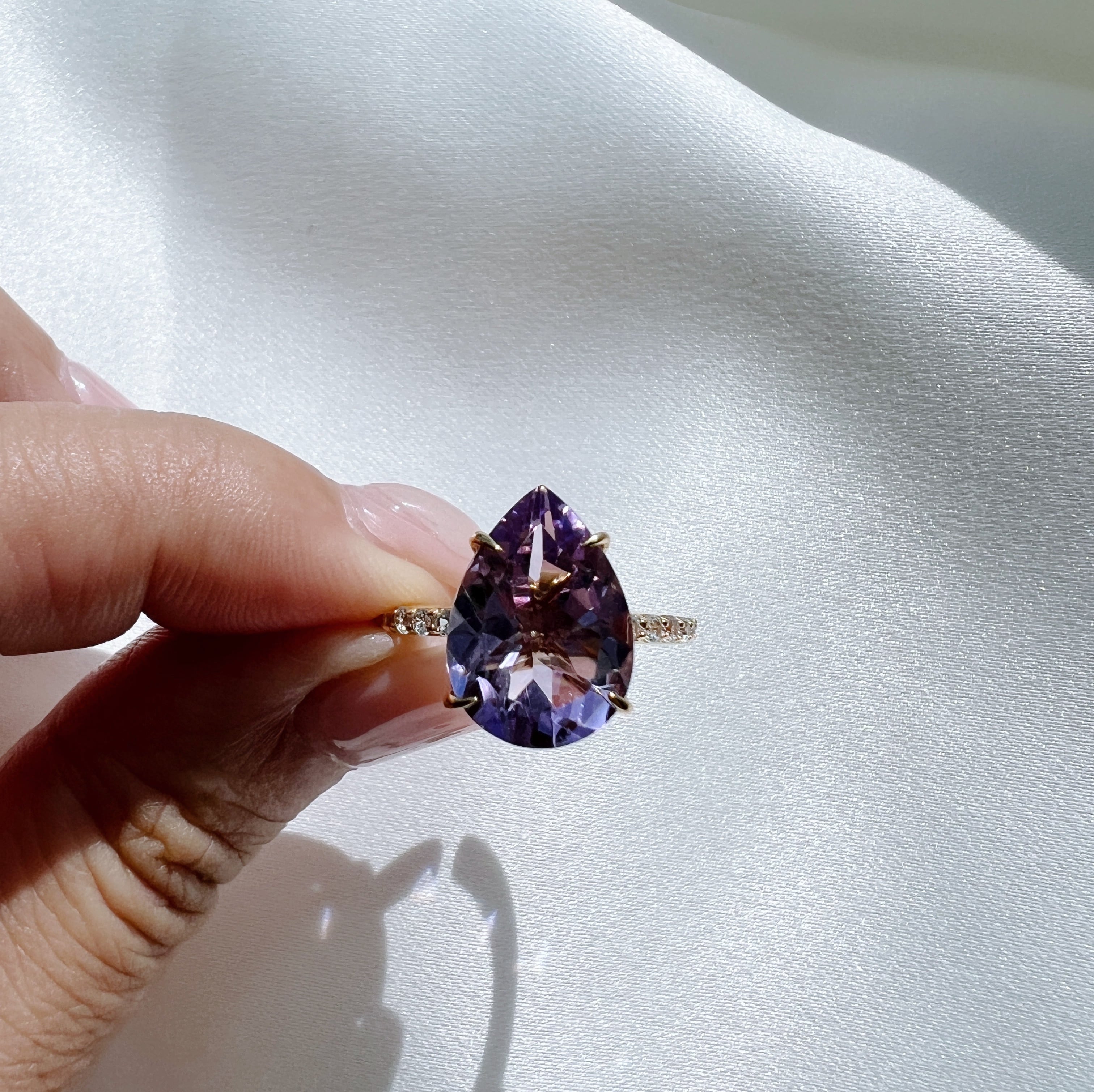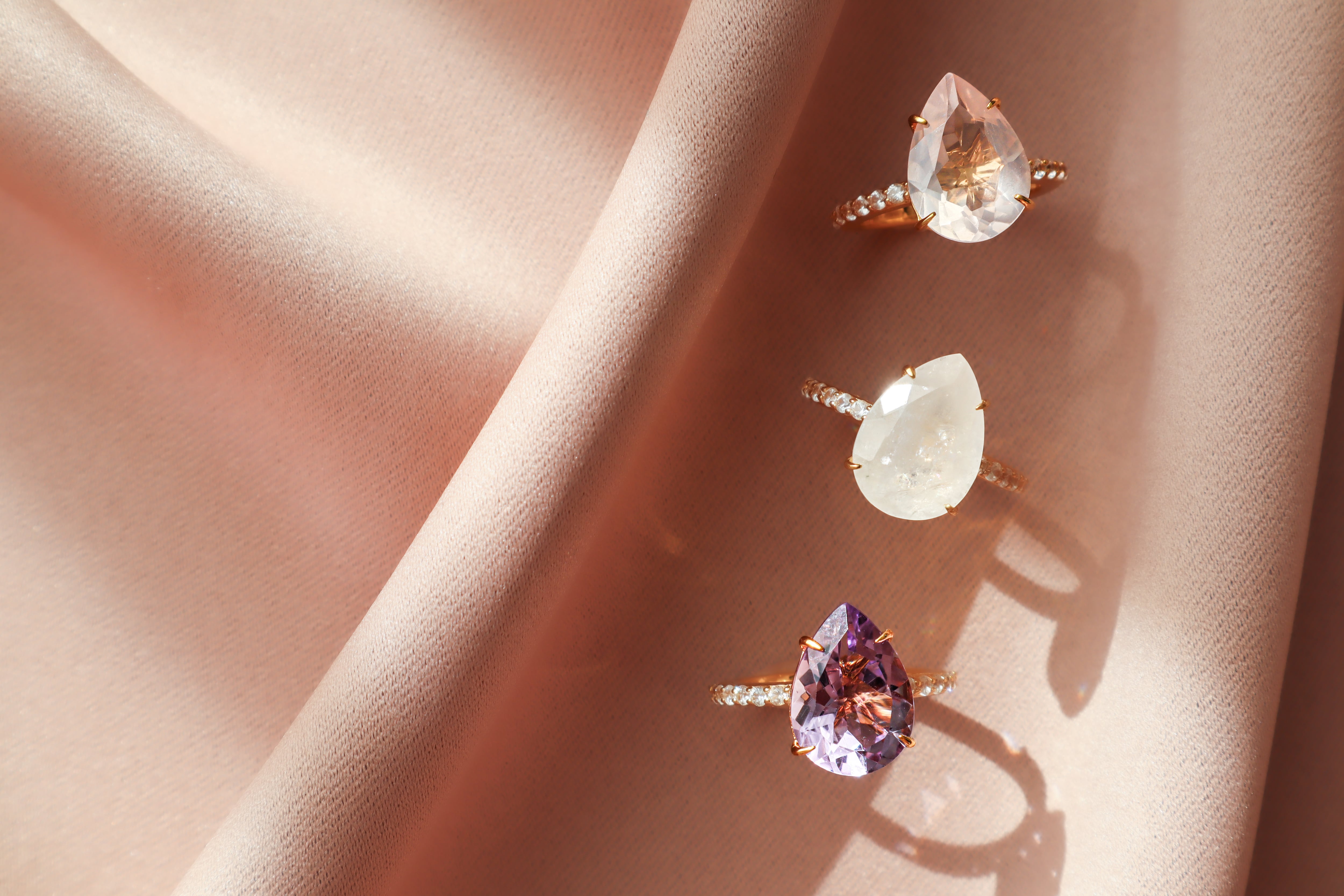 透明感があり、キラキラとした輝きがあるファンシーカットの大粒ストーンを